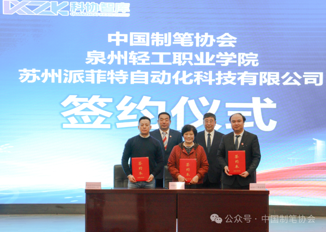2024年12月18日,中国制笔协会、泉州轻工职业学院及苏州派菲特自动化科技有限公司签署三方协议,苏州派菲特自动化科技有限公司向泉州轻工职业学院提供自动化制笔设备和师资力量,泉州轻工职业学院设立专业课程并提供培训场地,联合为我国制笔全行业培养自动化制笔设备维修保养专业人才。